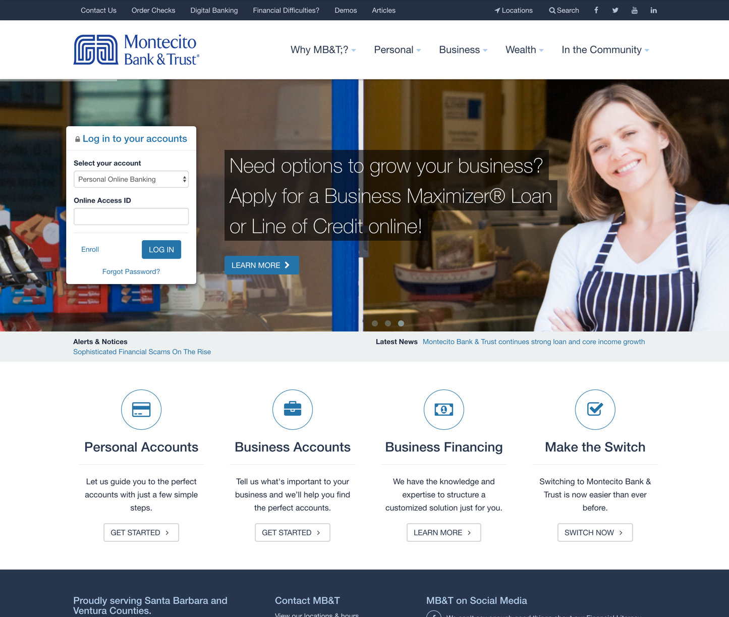 Montecito Bank & Trust, the largest locally owned community bank located on the Central Coast, needed a complete website refresh in order to modernize and take advantage of emerging technologies such as responsive web design. From initial concepts to a fully-functioning product, I provided MB&T with an all-new responsive design and completely rewrote the underlying code, reducing load times, increasing mobile and tablet functionality. Additionally, custom tools were built allowing employees to maintain and build website pages, track customer statistics, and administer various marketing programs.